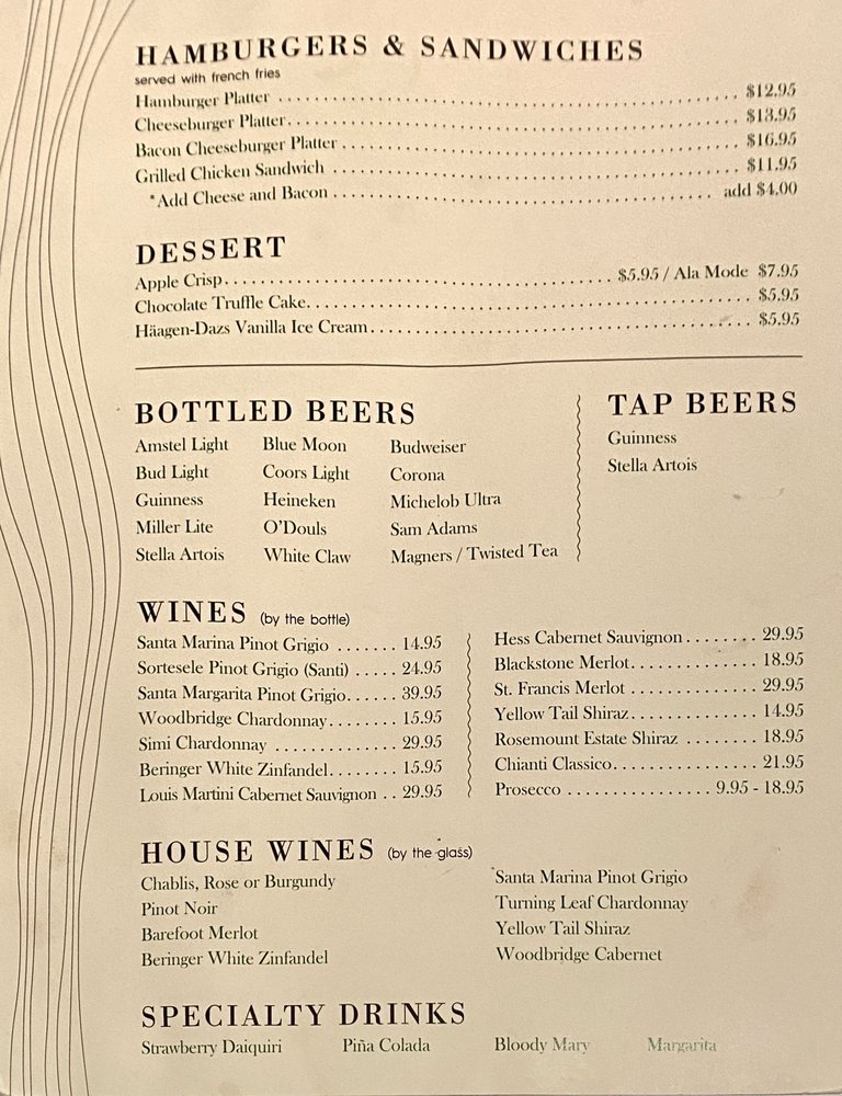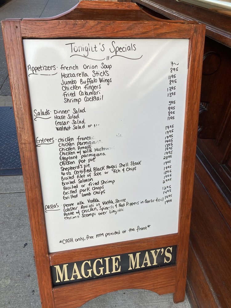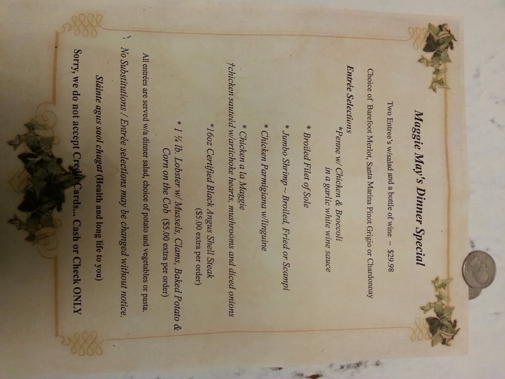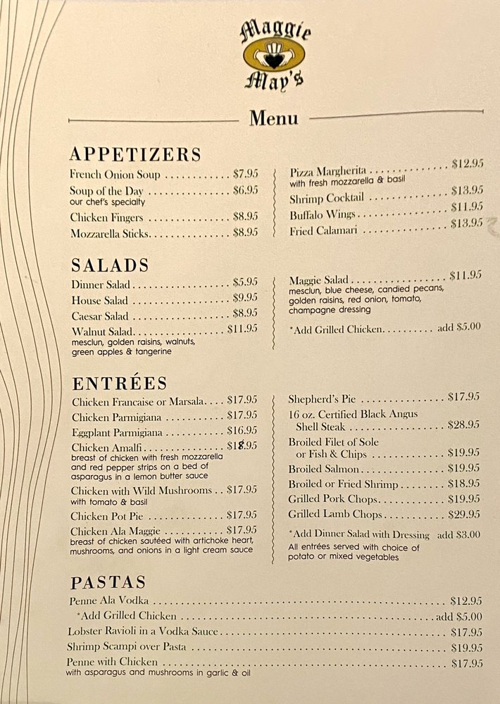 Maggie Mays offers a diverse menu featuring delectable options such as their famed French Onion Soup ($7.95) and Lobster Ravioli in Vodka Sauce ($18.95). You can also savor the Shrimp Scampi Over Pasta ($19.95) for a delightful seafood experience. Vegetarian choices abound, making it an inclusive dining spot for everyone.